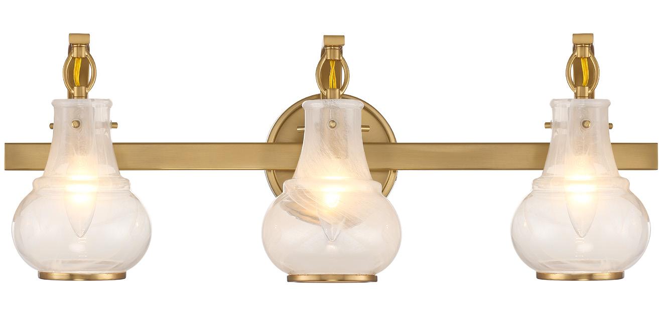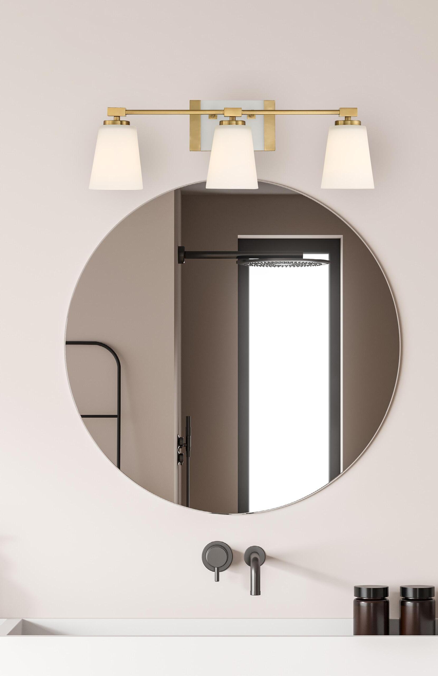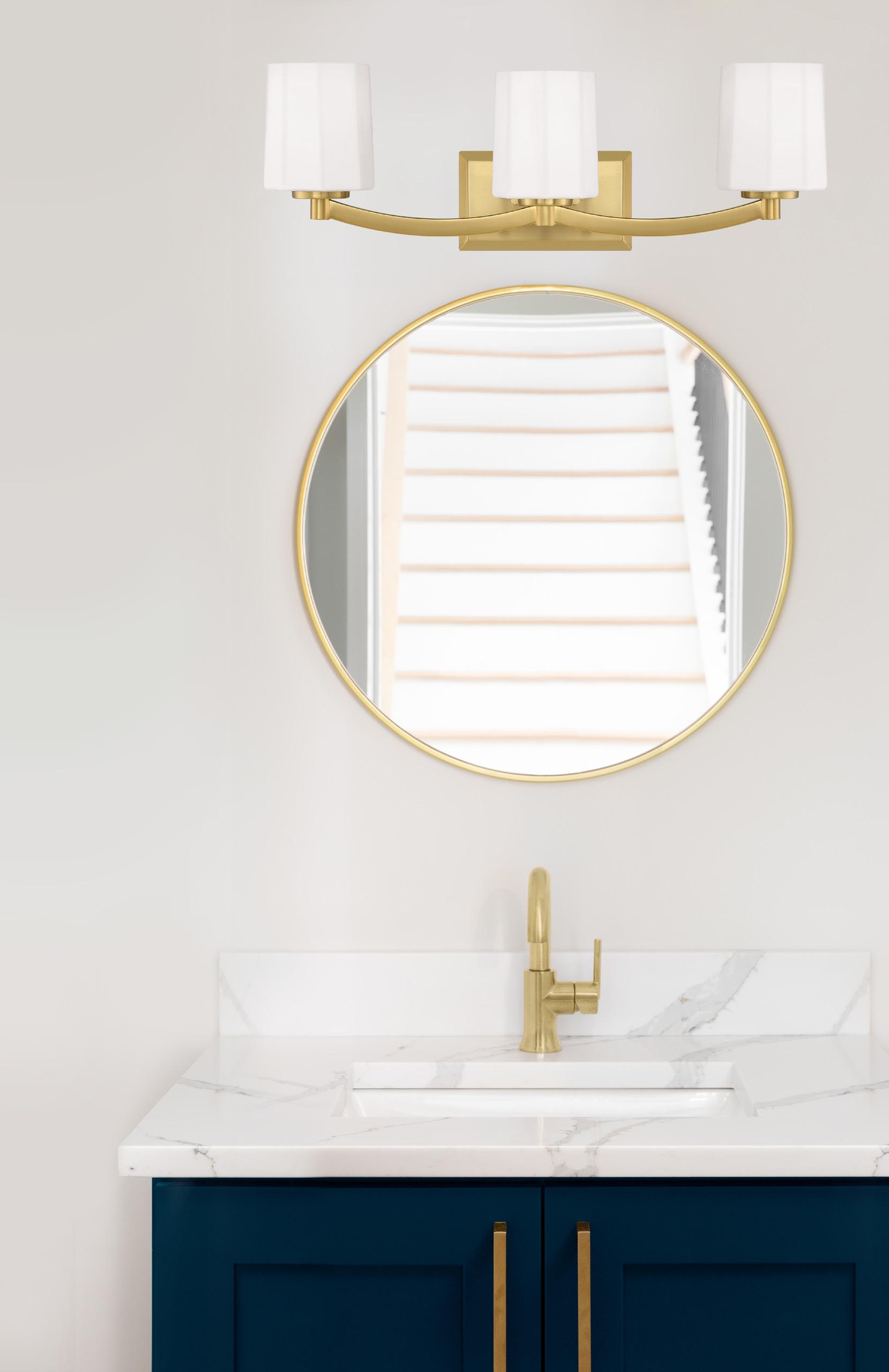 Get understated glamour for the bathroom with the Whitney bath light. Fluted shades of opal etched glass offer up a flattering glow while the curving arm adds intrigue and the warm brass finish brings versatility.