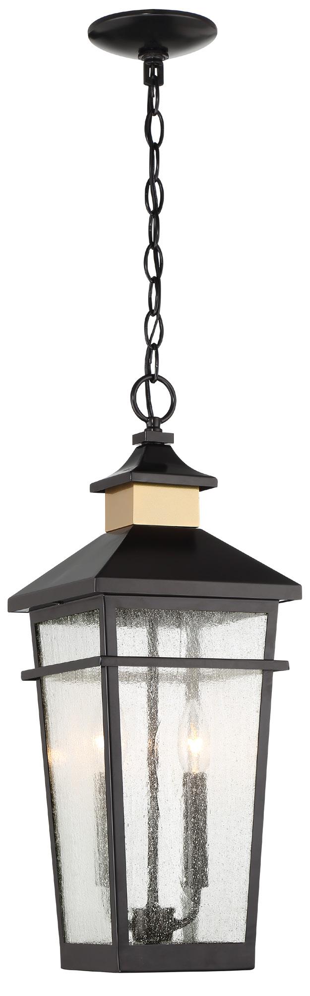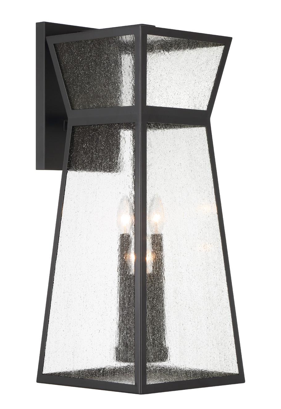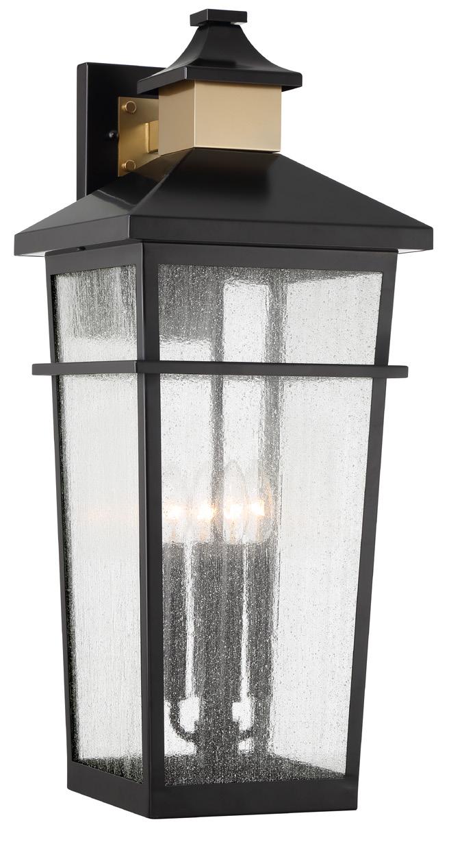 Kingsley has a coastal-inspired lantern style with highly fashionable touches. Panes of seedy glass are accentuated by a matte black finish with brass detailing at the backplate and hood.