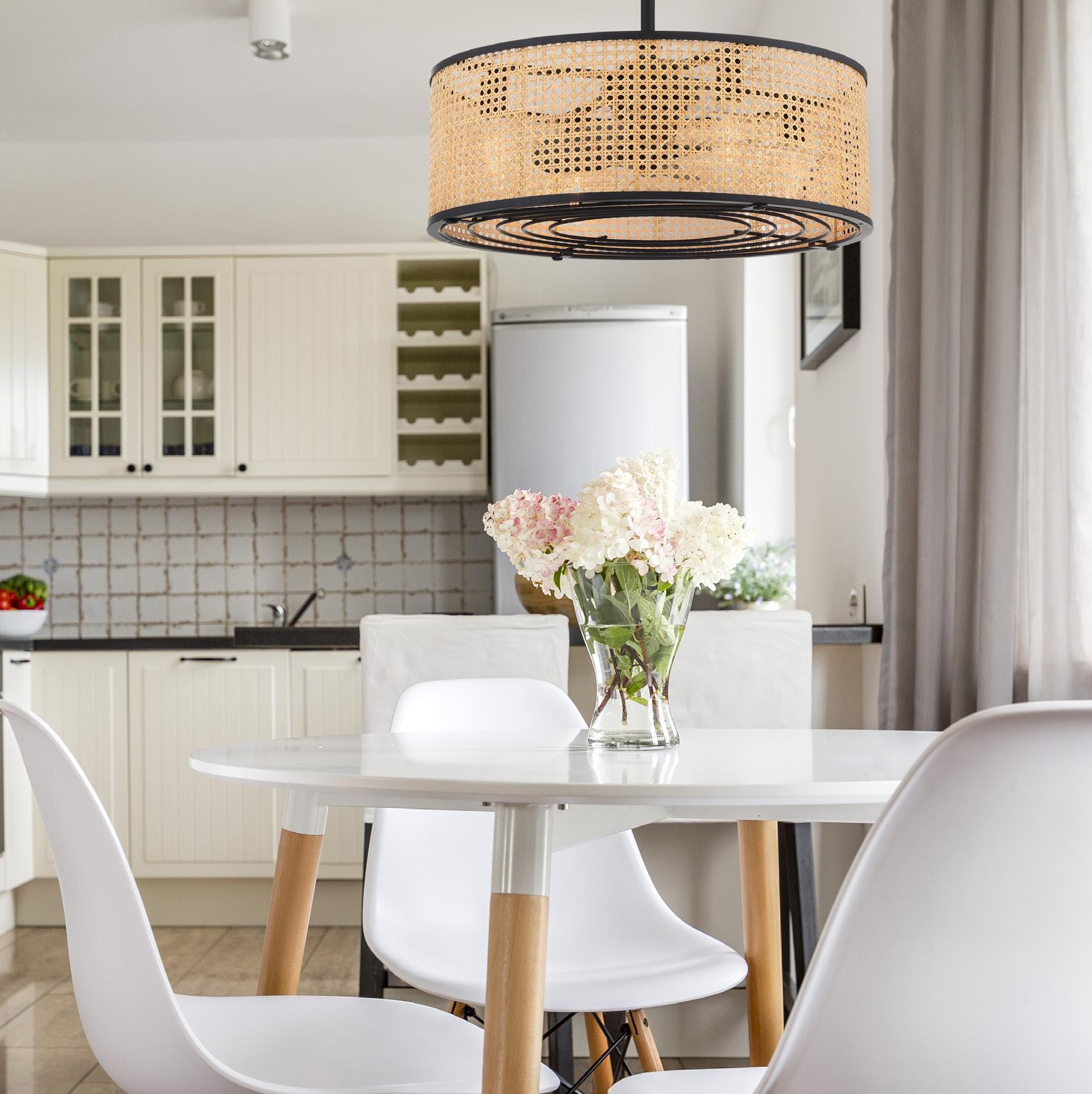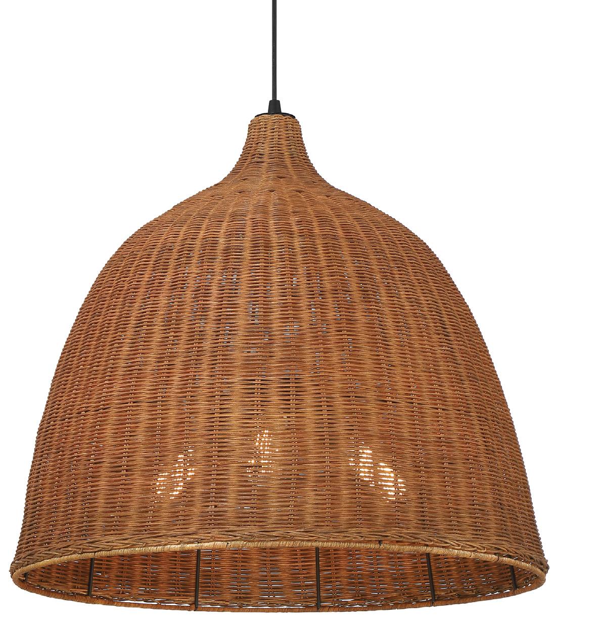 The Macra pendant draws style inspiration from the beauty and craftwork of woven baskets. It features a wide, large shade of dark brown wicker that will illuminate any room beautifully. The simple hardware, in a Cafe finish, allows the basket shade to take center stage.