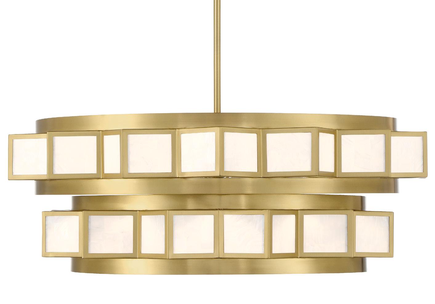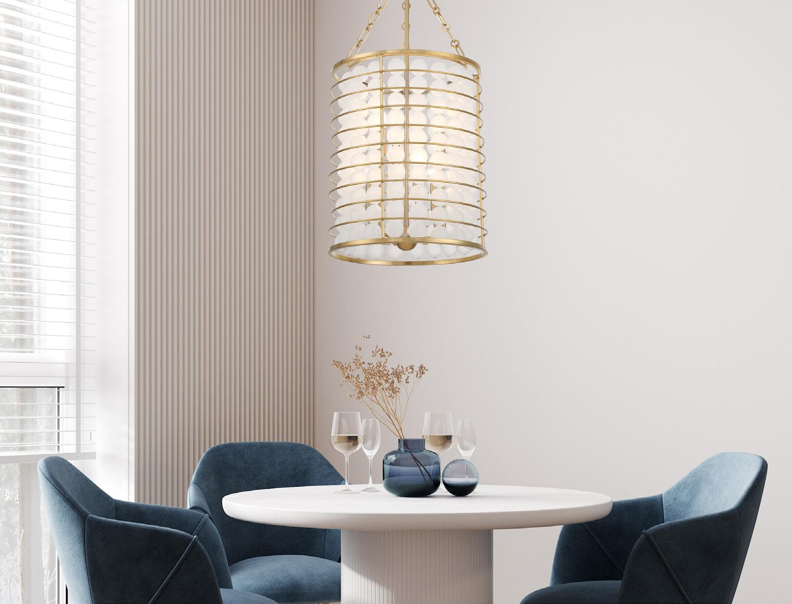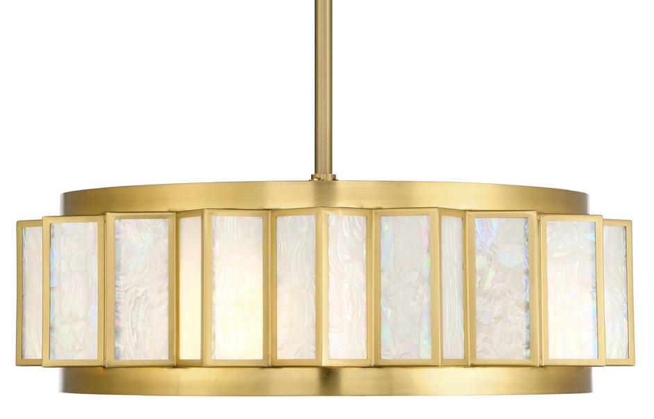 It is often said that lighting is the jewelry of the home - and the Gideon collection is an excellent example of this saying. Pieces of natural capiz shell are arranged into boldly geometric frames with a warm brass finish. When the lights are off, the unique swirls and patterns on the shell will mesmerize. When the lights are on, the shell will create a beautifully soft glow.