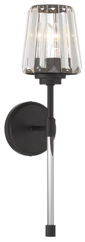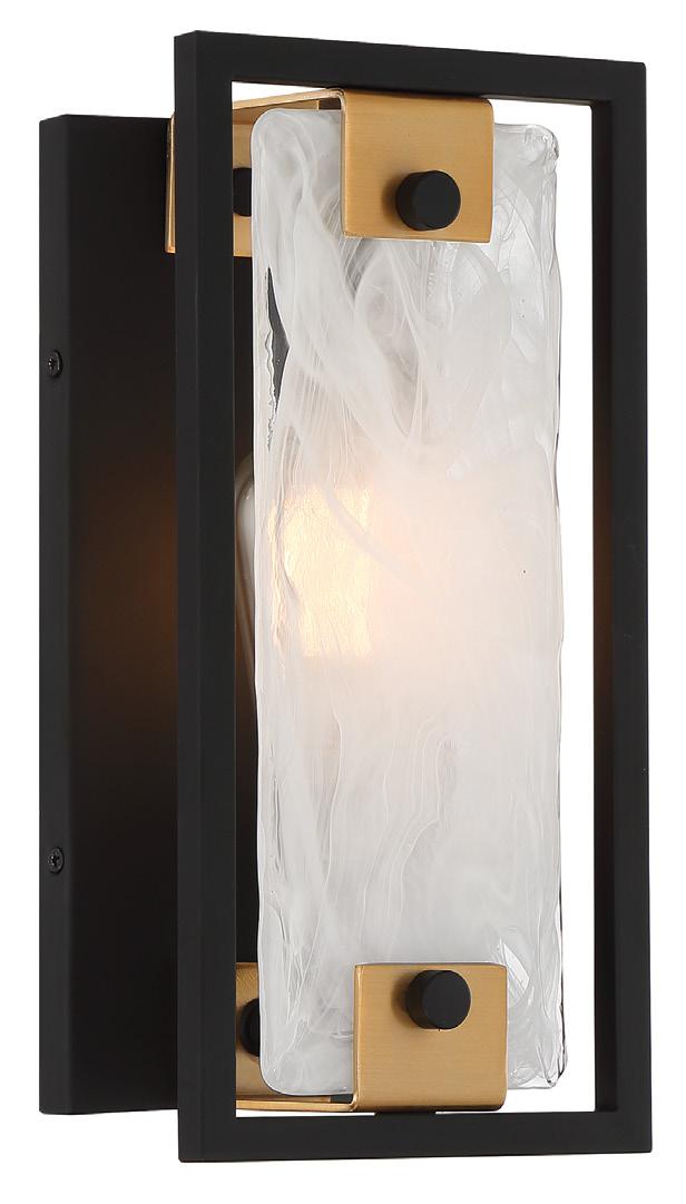 A fashionable blend of matte black and warm brass makes the Sidney a bold choice for the bath. Highly textured clear water glass shades add an extra dimension of intrigue.