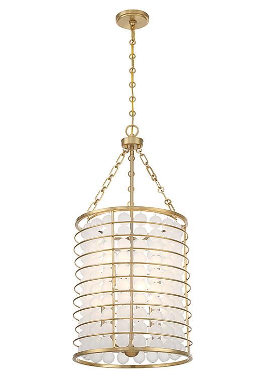 Create a breathtaking glow with Landon, which features a circular shade adorned with dramatically-cut pieces of calcite that are illuminated from within by integrated LED light sources. The warm brass finish adds to the bright, warm look.