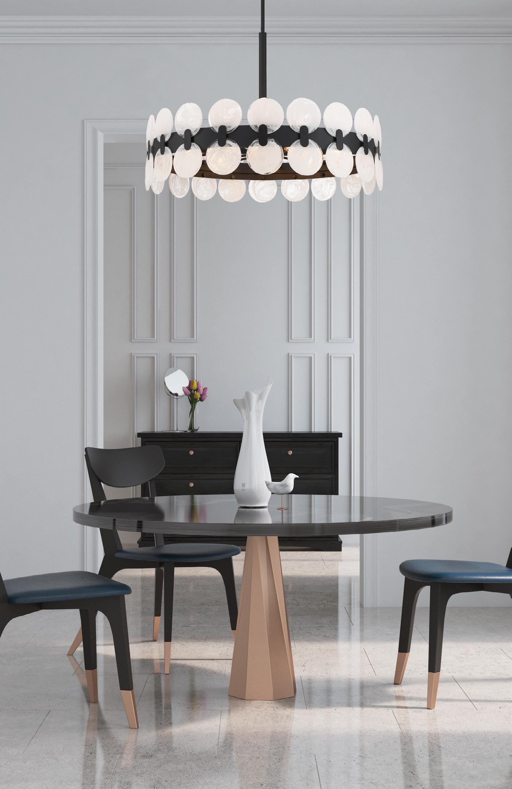 Discs of alabaster stone take center stage in the otherwise subdued design of Amani. The natural beauty of the alabaster is offset by a lovely matte black finish, creating a look that pops.