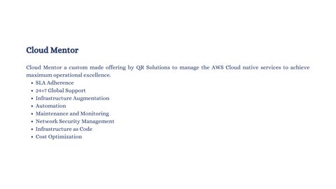Cloud Mentor a custom made offering by QR Solutions to manage the AWS Cloud native services to achieve maximum operational excellence.