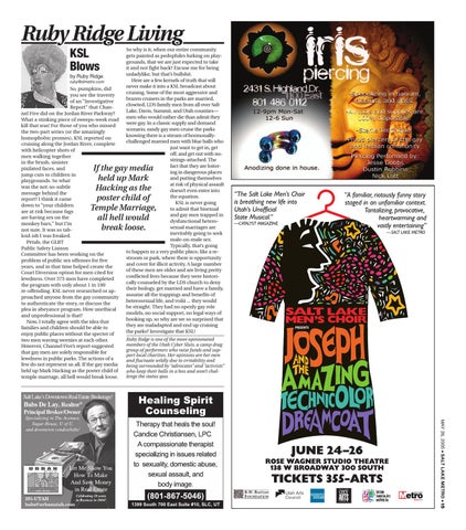 So why is it, when our entire community gets painted as pedophiles lurking on playgrounds, that we are just expected to take it and not fight back? Excuse me for being unladylike, but that’s bullshit. Here are a few kernels of truth that will never make it into a KSL broadcast about cruising. Some of the most aggressive and brazen cruisers in the parks are married, closeted, LDS family men from all over Salt Lake, Davis, Summit, and Utah counties— men who would rather die than admit they were gay. In a classic supply and demand scenario, randy gay men cruise the parks knowing there is a stream of hormonallychallenged married men with blue balls who just want to get in, get off, and get out with nostrings-attached. The fact that they are loitering in dangerous places and putting themselves at risk of physical assault doesn’t even enter into the equation. KSL is never going to admit that bisexual and gay men trapped in dysfunctional heterosexual marriages are inevitably going to seek male-on-male sex. Typically, that’s going to happen in a very public place, like a restroom or park, where there is opportunity and cover for illicit activity. A large number of these men are older and are living pretty conflicted lives because they were historically counseled by the LDS church to deny their biology, get married and have a family, assume all the trappings and benefits of heterosexual life, and voilá ... they would be straight. They had no openly gay role models, no social support, no legal ways of hooking up, so why are we so surprised that they are maladapted and end up cruising the parks? Investigate that KSL!