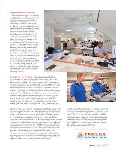 Investeren in techniek én mensen! Doorlopende investeringen in de nieuwste installatietechniek én in onze mensen, zijn de basis voor het succes van PAREE B.V. Met 160 personeelsleden bedient PAREE B.V. klanten in o.a. de food industrie en in toenemende mate in instellingen, waarbij complete gebouwbeheerssystemen, kortweg domotica, en digitalisering een steeds grotere rol speelt. Een woning of bedrijf met een digitaal netwerk, is net zo vanzelfsprekend als de aansluiting van gas, licht en water. Ook in nieuw facilitair vastgoed, zoals scholen, appartementen en hotels, is het digitale netwerk een substantieel onderdeel in het bouwtraject. De vraag naar 24/7 beheer en onderhoud neemt fors toe en dat resulteert in groei in het aantal onderhoudscontracten. PAREE B.V. houdt alles in eigen hand en onze technici zijn deskundigen in het aanleggen en onderhouden van de meest complexe besturingssystemen. Draadloos werken in de cloud Op steeds meer werkplekken is
