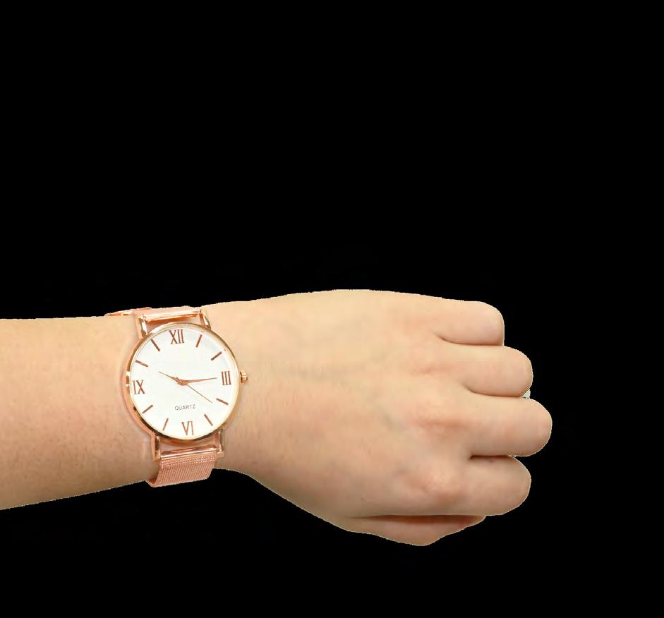This rose gold-tone watch is as comfortable as it is elegant. The metal mesh band feels so cool and silky on your wrist, while the pure white face with Roman numerals and curved bezel completes the look. It’s a beautiful and striking enhancement to any outfit, while the rose gold and white coordinate superbly with silver and gold jewellery.