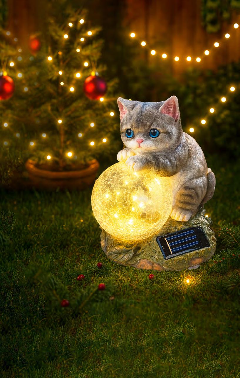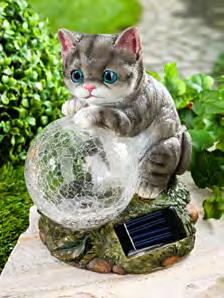 Lovingly hand-painted, this adorable grey moggie with kitten-blue eyes and fluffy white paws rests sweetly on a frosted glass shade that lights your garden at night with a warm inviting glow. Powered by a builtin 2V battery and solar panel for daytime charging, the 150-lumen LED operates for up to 10 hours through the night. Crafted from weather-proof poly resin, it measures 20x15x18cm. it’s a perfect gift for cat lovers and garden enthusiasts alike.