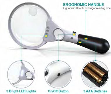 Medicine bottles, newspapers, crosswords, crafts and hobbies! You can see them all clearly with Multi Magnifying Reader. It features 20 LEDs with 3 levels of brightness, a large grip handle, and 2x optical lens with handy 8x spot magnifier. Includes recharging USB cable, fabric case, and microfibre cloth.