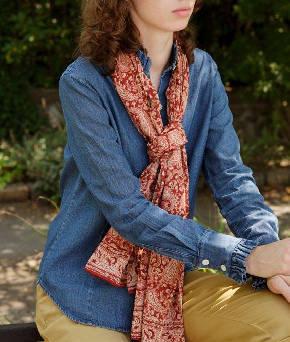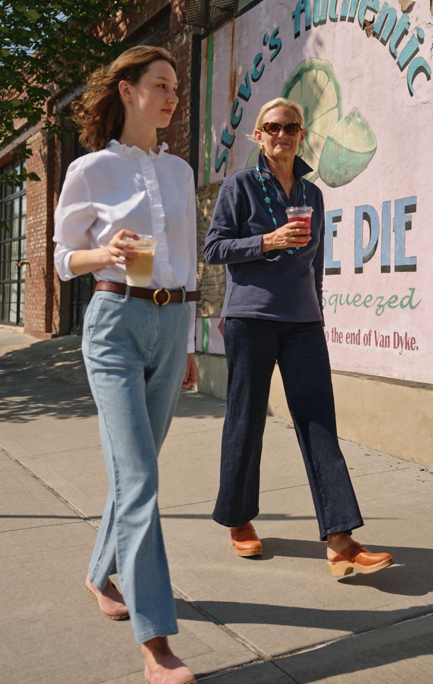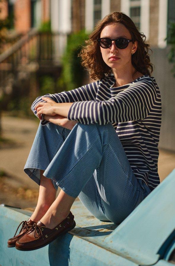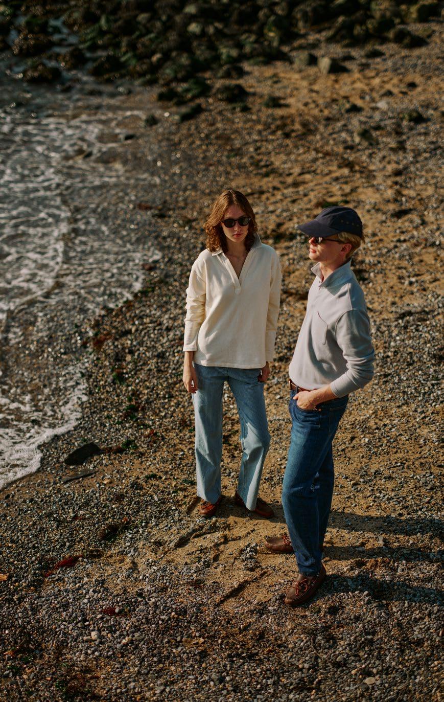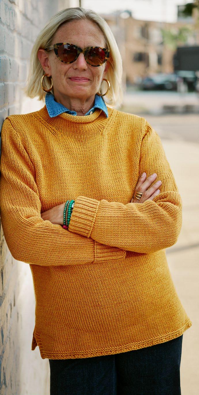 left page, on her: Women’s Fisherman Sweater in Sun Mix $158.