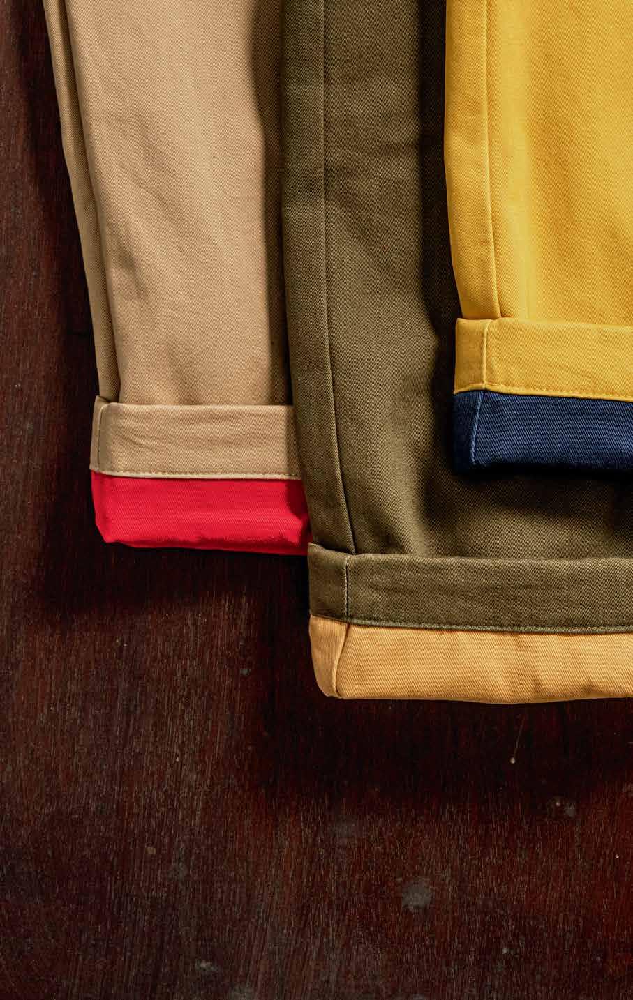 below, from left: Flannel Lined Ausable Pant $198 in Khaki, Olive, and Squash.
