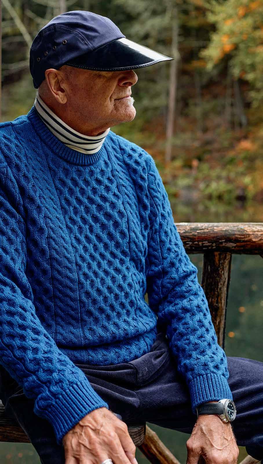 left page, on him: Fisherman's Sweater in Denim Mix $158. left page, on her: Women's Deep Sea Fisherman's Sweater in Indigo $168. this Page, from top: North Sea Fisherman’s Sweater $178, Laplander Sweater in Antique White $228, Fisherman’s Sweater $158 in Navy, Olive, and Egret.