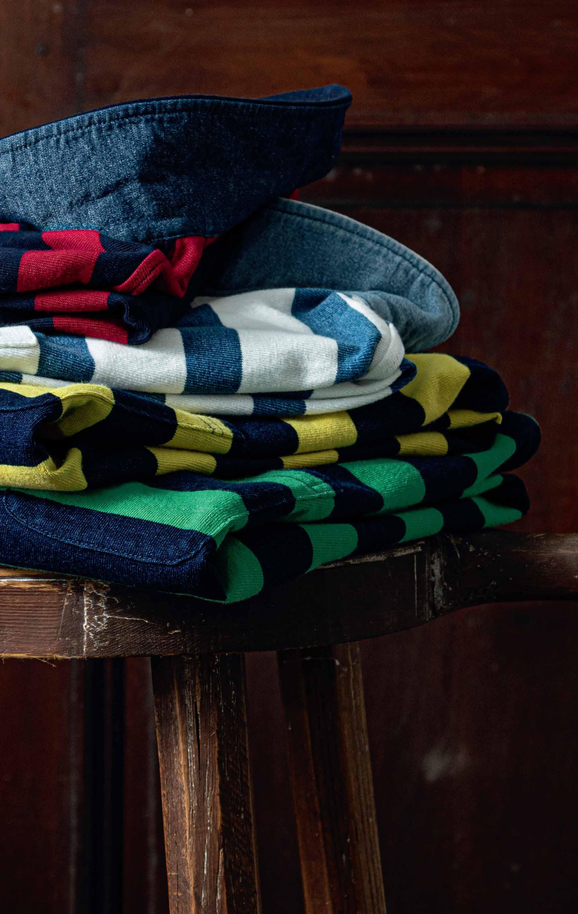 left page, on him: Long Sleeve Indigo Polo in Navy/Burgundy Wide Stripe $118, Guatemalan Whip Stitched Belt in Solid Turmeric $98. this page, from top: Long Sleeve Indigo Polo $118 in Navy/Burgundy Wide Stripe, Blue/Antique White Wide Stripe, Navy/Chrome Wide Stripe, Navy/Billiard Green Wide Stripe.