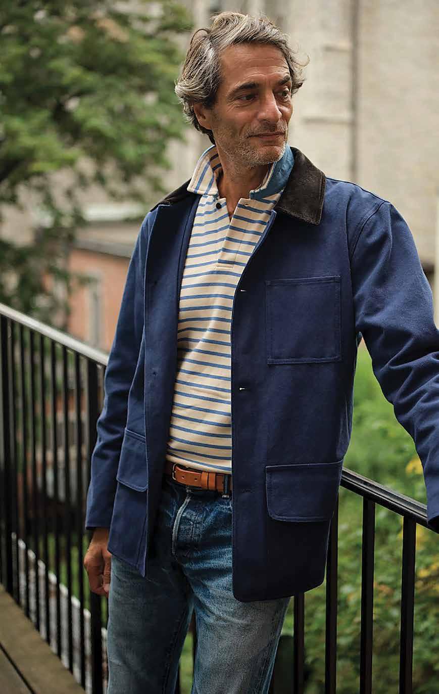 on him: Bridge Jacket in Navy $328, Work Shirt in Chambray