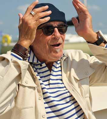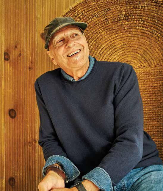 on him Fisherman’s Sweater in Olive $148. Flannel Chore Shirt in Weathered Red Plaid $148. Quaker Chino in Khaki Twill $188, Oysterman Cap in Khaki $58. on left, from top Fisherman’s Sweater $148, in Navy/Egret Stripe, Navy/ Burgundy Stripe, Denim Mix, Navy, Egret, Olive.