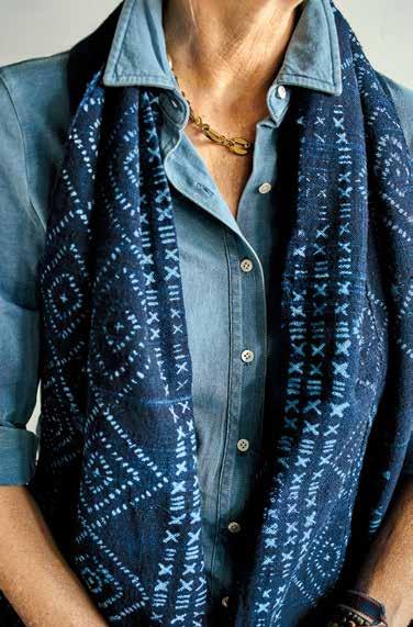 left page, from left Avalon Indigo Knit Top $138, in Mid-Wash Jacquard Stripe, 3/4” Red/ Navy Stripe, Red/Navy Double Stripe, Blue/White Stripe, Washed Jersey and Avalon Knit Top $128 in Cobalt, Off White, Navy. left page, on her Avalon Indigo Knit Top in Washed Jersey $138, Mud Cloth Scarf in Indigo $88.