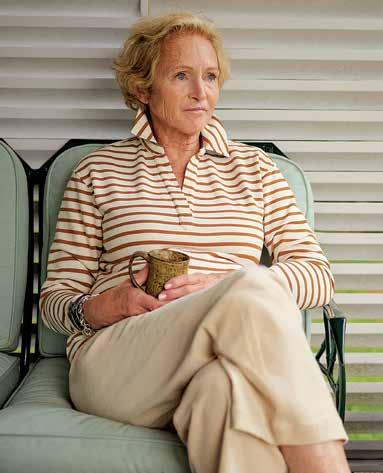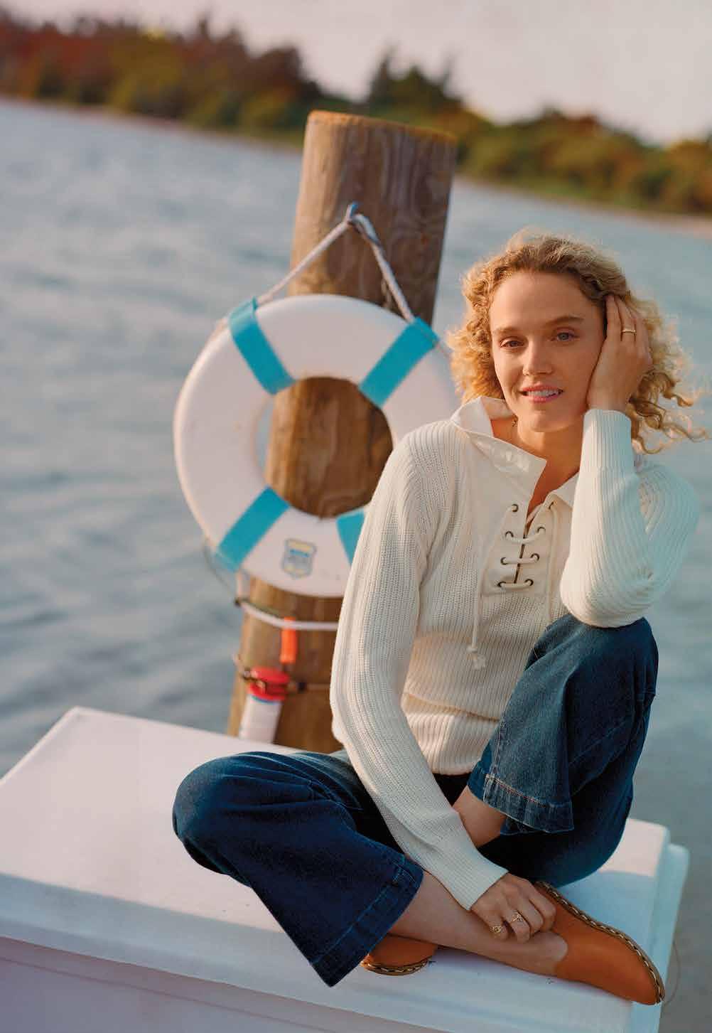this page, on her Shoreline Sweater in Egret $218. this page, left: Bluffton Wool Felt Hat in Pecan $118. Stowe Sweater in Navy $198. Shoreline Sweater in Egret $218.