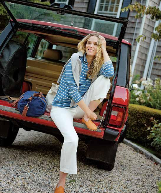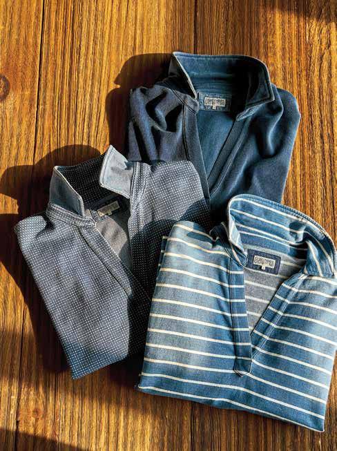 left Inlet Pullover in Indigo/White Stripe $138. Women’s Five Pocket Jean in White Denim $158. Women’s Quaker Crewneck Sweater in Pearl $158. this page, below right Indigo Inlet Pullover $138, in Heavyweight Pique, Birdseye Pique, and 3/4" Indigo/White Stripe.