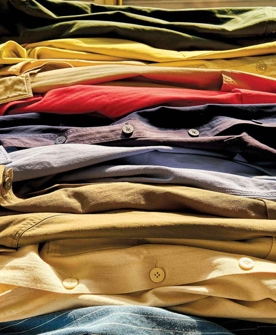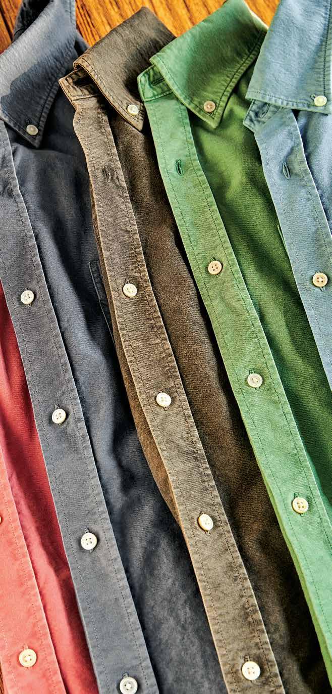 this page, from left Garment Dyed Oxford Shirt $128, in Faded Red, Weathered Navy, Graphite, Spruce, Chambray.