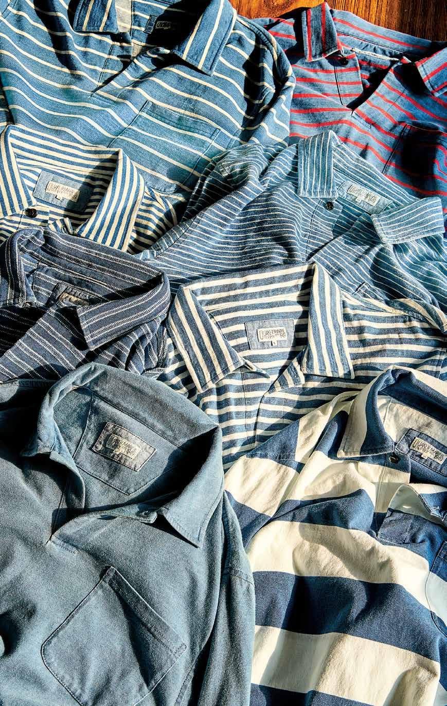 this page, from top left A. Heavyweight Long Sleeve Indigo Polo in 3/4" Indigo/White Stripe, B. Long Sleeve Indigo Polo in 3/4" Red/Navy Stripe, C. Blue/White Stripe, D. Blue/White Slub Stripe E. Mid-Wash Jacquard Stripe, F. Blue/White Even Stripe, G. Washed Jersey H. Blue/White Rugby Stripe. A. $128 B-H. $108. E. A. A.