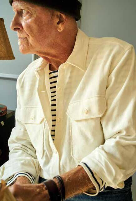 front cover, right on him Lorimer Jacket in Navy $238. Flannel Chore Shirt in Weathered Navy Plaid $148. Camden Pant in White Herringbone Twill $138. Surcingle Belt in Navy $98. Roll Up Yacht Cap in White $68.