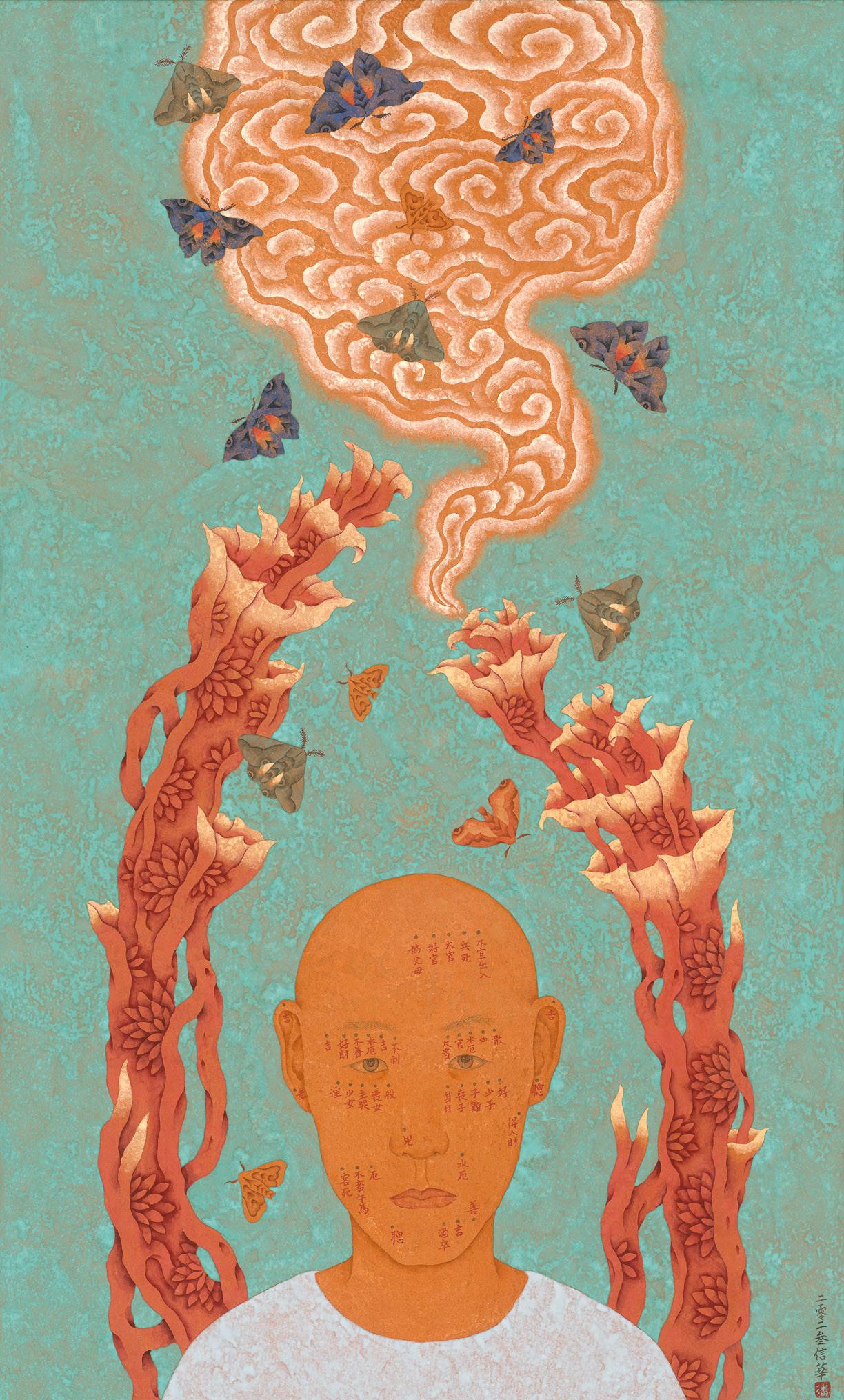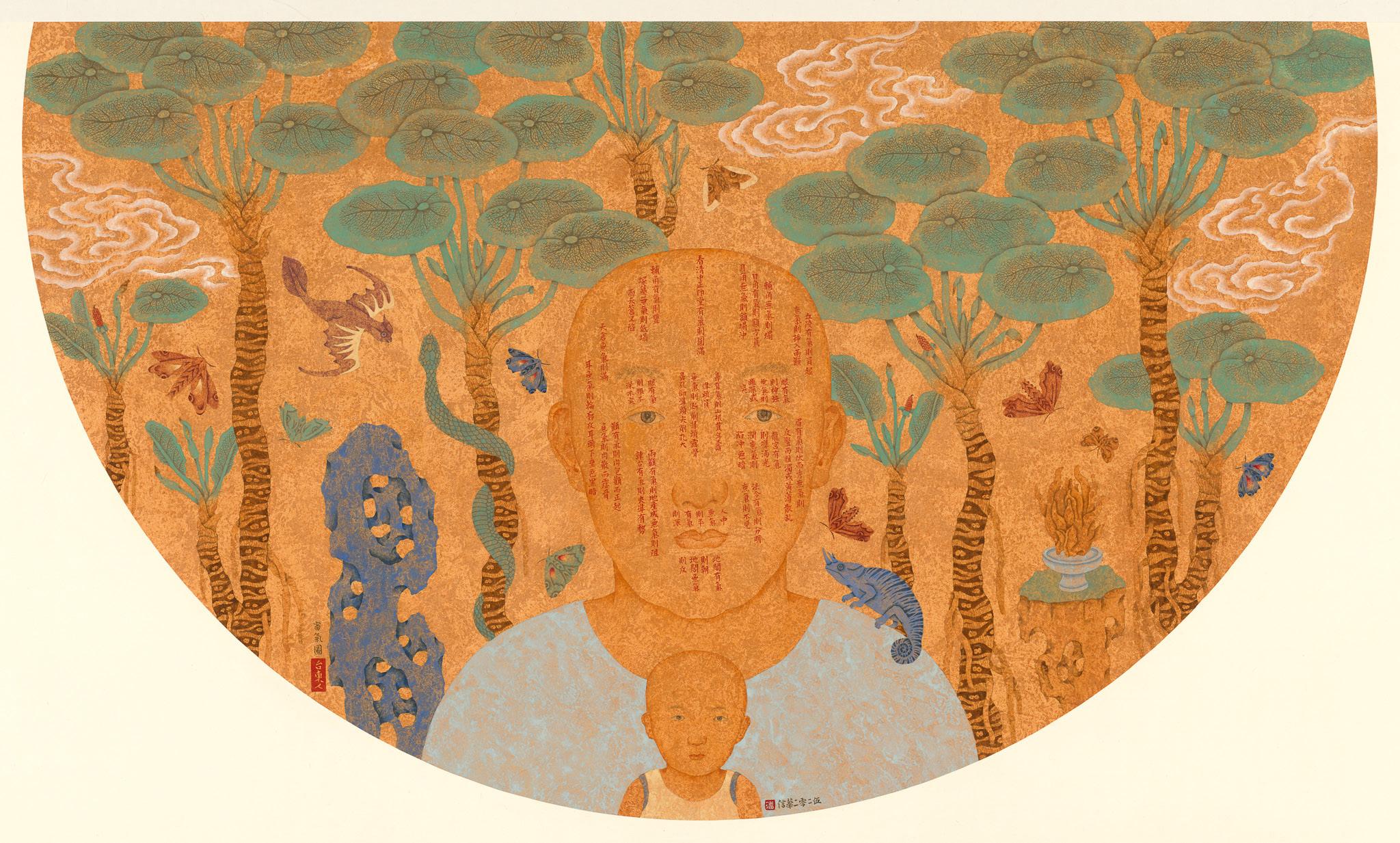 In Pan’s painted worlds, he often includes small human figures: children posed as prematurely world-weary adults. The child, mimicking adult posture with serious composure, represents associations with traditional imagery or poetic allusions, yet at the same time is drawn to seem strangely out of place. The anachronistic figure coexists with ancient and modern artifacts: religious and folk symbols, natural Taiwanese flora and fauna, architecture, meridians, mythical creatures, and butterflies, all integrated without hierarchy.