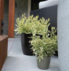 • Serrated, grey-green leaves with creamcolored margins are the focal point