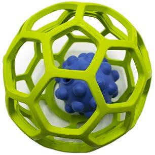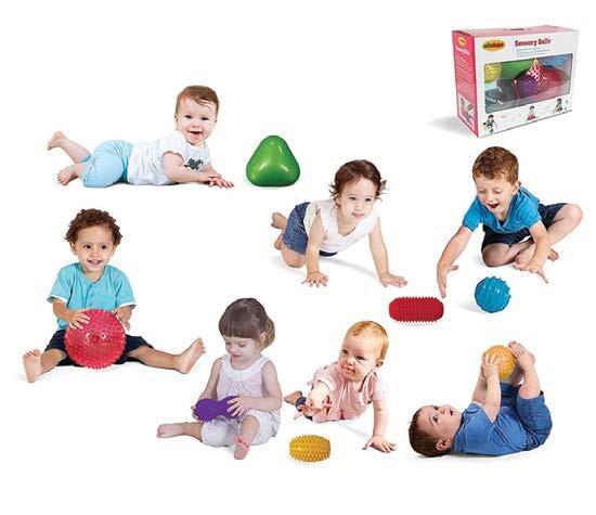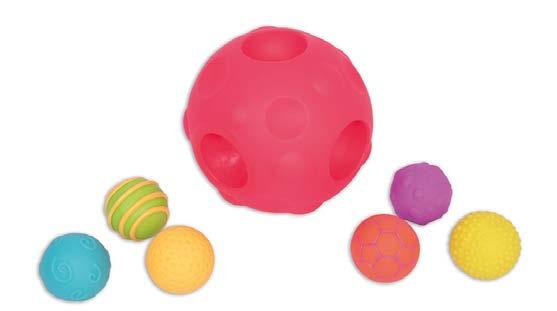 Set includes a large, 8 cm (3-1/8”) Diam. textured ball and 6 smaller balls of various colours and textures that fit into craters around the surface of the larger ball. Ages 6 months+