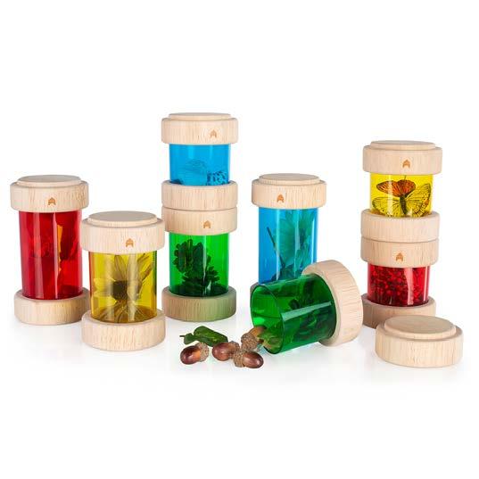 Find trinkets, natural materials and sensory objects to collect. The round, transparent tubes with removable covers hold small objects to observe, display or rattle. Ideal for color and sound exploration and light table activities. Holds marbles, beads, twigs, leaves, small toys and more. Stack the tubes on top of each other to customize play experience. Easy-to-remove wooden top keep objects securely in place until ready to be replaced. Set of 8. Ages 3+