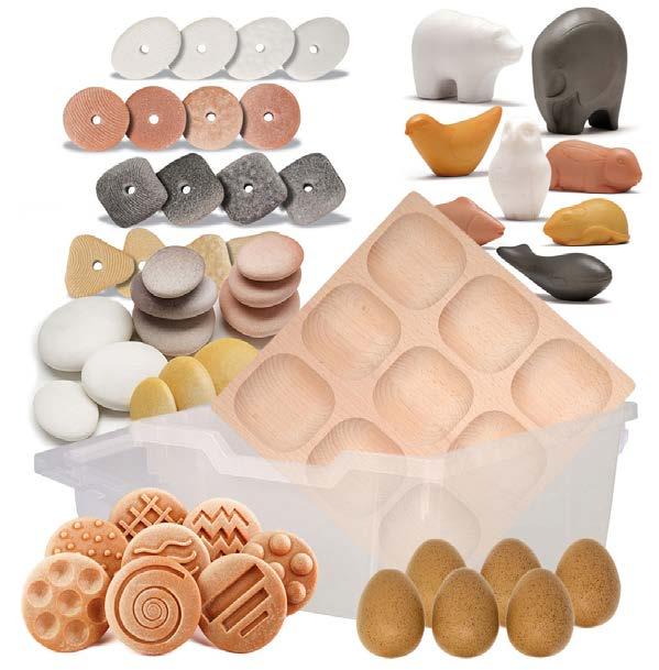 Sensory Play all in one place! Includes sorting tray and 12 tactile stones for sorting, 12 sensory stones, 6 speckled sound making eggs, 16 threading pebbles with laces, and a set of 8 sensory play animals. Ages 3+