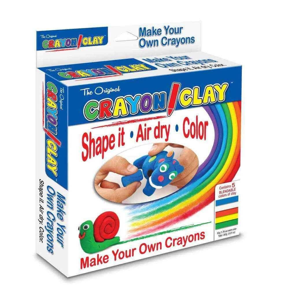 This new product is the ONLY clay that magically dries into a fully functional crayon! Each box comes with 5 blend-able colours of clay that you can shape into anything. Once dry, after 24 hours, the hardened clay is now a crayon! All ages