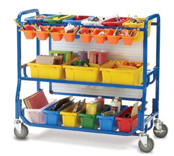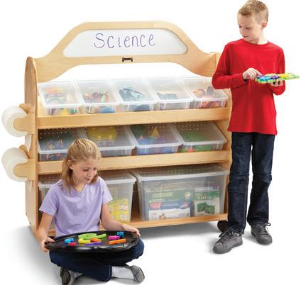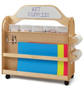 Store and organize your STEAM supplies on this handy mobile cart. The top 2 angled shelves include 5 clear cubbie-trays with lids and 4 clear tubs with lids while the bottom shelf holds 2 large totes with lids. A double-sided write and wipe sign at the top is perfect for announcing cart contents or project themes. Baltic birch plywood construction. Fully assembled. 10-year warranty. Measures 122cm W x 51cm D x 131cm H (48” W x 20” D x 51-1/2” H). All Ages | Grades K-6 704144