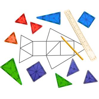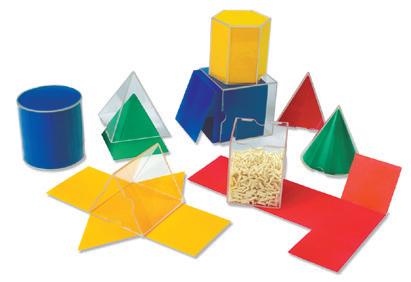 Perfect for hands-on learning and illustrative teaching of area, volume, surface area-nets, symmetry and perimeter. Includes 8 transparent shapes and 8 folding shapes: cylinder, square, pyramid, cube, rectangular prism, cone, hexagonal prism, triangular pyramid and triangular prism. Ages 7+ | Grades 2+ 202245 Set of 16