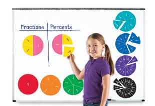 Demonstrate fractions, percentages and equivalencies on your whiteboard. Labelled with fractions on the front and percentages on the reverse. Includes 9 circles (whole, halves, thirds, fourths, fifths, sixths, eighths, tenths and twelfths) and activity guide Measures 19cm diameter. Ages 6+ | Grades 1+ 202279 51 pieces