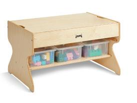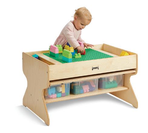 The perfect addition to any preschool learning space, these building tables encourage kids to use their imagination while improving their fine motor skills. Features side rails to keep bricks from falling off and storage in each end. Includes a removable cover that allows the table to be used for other activities and a shelf below the tabletop with three clear tubs and lids. Fully assembled. 10-year warranty. Measures 89cm W x 61cm D x 50cm H (35” W x 24” D x 19-1/2” H). Ages 3+ | Grades Pre K+ 212868