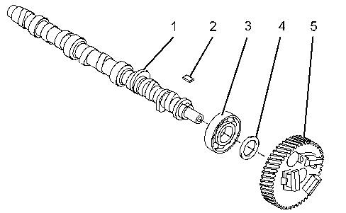 4. Align gear (5) with woodruff key (2). Use a suitable press to install the gear to the nose of camshaft (1).