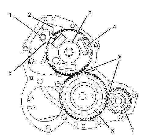 5. Rotate the crankshaft until timing marks (X) are aligned on the following gears: