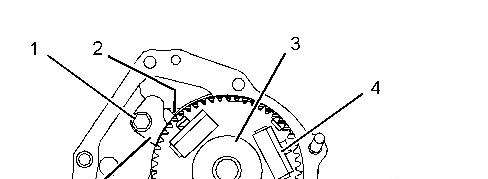 3. Rotate camshaft gear (4) to align the accesshole in the camshaft gear with fastener (2).