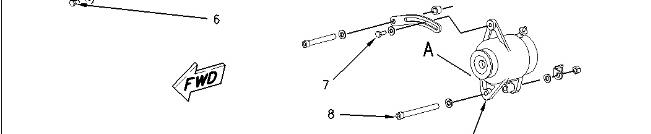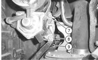 2. Remove bolts (3). Removebolts (6). Removecover (5). Loosen bolts (7) and (8).Remove belt (4). Remove bolts (7) and (8). Remove alternator (9) .
