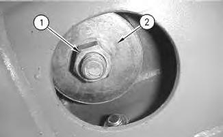 5. Install large washer (2) and nut (1) from the inside of the cab. Tighten the nuts to a torque of 125 ± 10 N·m (92 ± 7 lb ft).