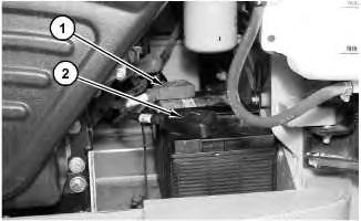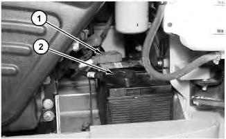 1. Raise the cover on the negative terminal of the battery. Disconnect negative terminal (2) of the battery. Place a protective cover on the negative terminal of the battery.