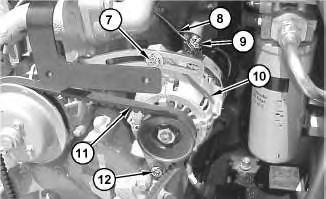 4. Slide alternator (10) away from the engine in order to tighten V-belt (11) .