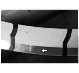 The uneven loading can come from twisted toric and cocked sealsand is muchworse when the weather is cold andthe toric are not resilient enough to keep the faces of a crooked seal together during rotation. Also,the area that is in contact has a highunit pressure load that could leadto scoring(Refer to Illustration 33).