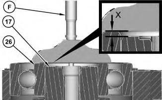 22. This step determines the correct preload adjustment for shaft assembly (17). Use Tooling (H) to measure Distance (X). Distance (X) is the measurement from the face of the inner bearing race to the face of shaft assembly (17). The correct shim thickness is determined by subtracting 0.1 mm (0.004 inch) from Distance (X).
