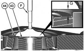 14. This step determines the correct shaft preload adjustment for shaft assembly (43). Use Tooling (H) to measure Distance (G). Distance (G) is the measurement from the face of the inner bearing race (44) to the face of shaft assembly (43). The correct shim thickness is determined by subtracting 0.1 mm (0.004 inch) from Distance (G).