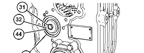 10. Raise the temperature of bearing (44) and install bearing (44). Install race (33). Apply Tooling (E) to bolt (31). Install washer (32) and bolt (31) . Tighten bolt (31) to a torque of 139 N路m (103 lb ft).