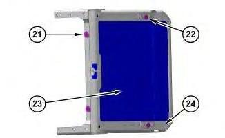 1. Position cooler frame (24) on its side on to suitable cribbing. Install radiator (23). Install two bolts (21). Tighten bolts (21) to a torque of 50 ± 10 N·m (37 ± 7 lb ft). Install two bolts (22). Tighten bolts (22) to a torque of 30 ± 7 N·m (266 ± 62 lb in)