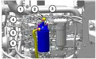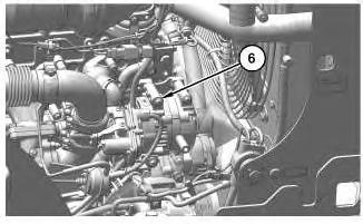 4. Remove clamp (6). Disconnect and set to the side diesel exhaust fluid lines (2) and harness connectors (4).