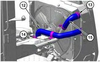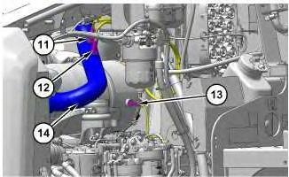 5. Remove clamps (13) and (14). Remove hoses (12) and (15).