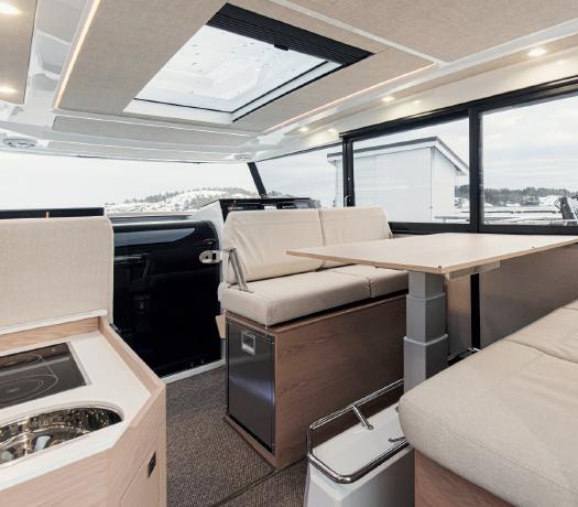 A socializing space can be created by flipping the backrest at the helm towards the aft sofa. The cabin is designed so that it’s easy to connect it with the space on the aft deck, the rear window and door can be opened to create a combined lounge area.